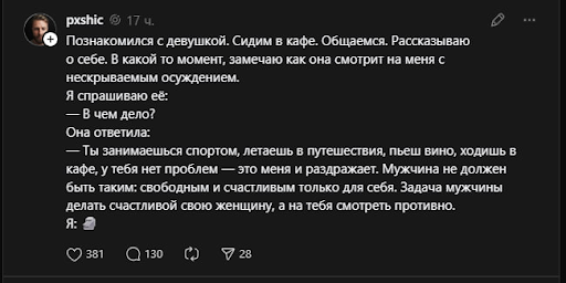 Реакция мужчины (эмодзи камня 🗿) в психоанализе можно интерпретировать как «каменную стену» (stonewalling) — единственно возможный способ сохранить целостность границ, когда на тебя совершается столь агрессивная проективная атака.